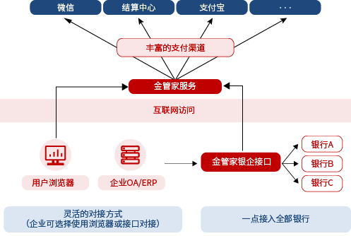 企業可以根據實際需求通過WEB方式或通過API方式接入。通過WEB接入方式,企業只需要使用普通辦公電腦或平板電腦即可接入使用。通過API方式接入方式,企業可以實現ERP、財務系統直接對接金管家系統獲取賬戶數據及下達交易指令。